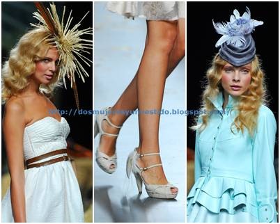 .- Agatha Ruiz de la Prada. Fiel a su estilo nos presenta una colección con prendas coloridas y de formas geométricas y volumétricas. Destacamos los vestidos, pantalones, shorts confeccionados en tejidos muy veraniegos de formas esféricas, cuadradas o rectangulares. Los tejidos empleados para ello son los tafetanes, linos, sedas, el demin o el plástico nacarado. La paleta cromática es muy rica, vimos amarillos, naranjas, rojo, fucsia, turquesa y azul. Cabe destacar las menorquinas con plataforma, sandalias de cuña de madera con tacones de colores, turbantes de diversos tamaños y formas.