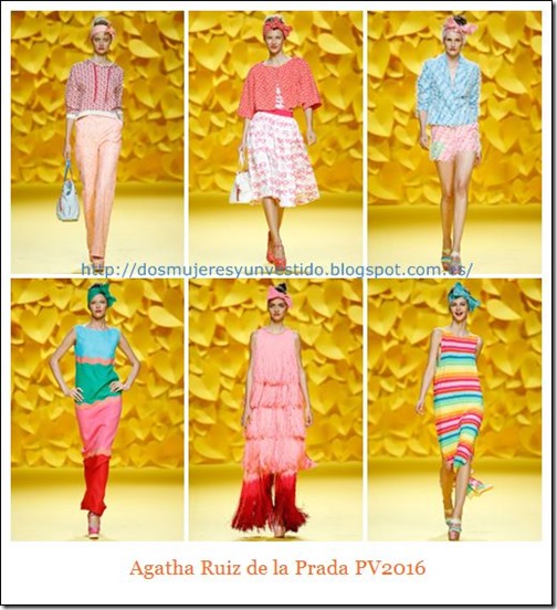 - Agatha Ruiz de la Prada. Nos propone una colección con prendas funcionales pero sin olvidar el color y los estampados mas característicos de la marca. Faldas de vuelo, chaquetas cortas, pantalones rectos, shorts, camisetas estampadas, vestidos de flecos y estampados de corazones, estrellas, rayas o de flores….