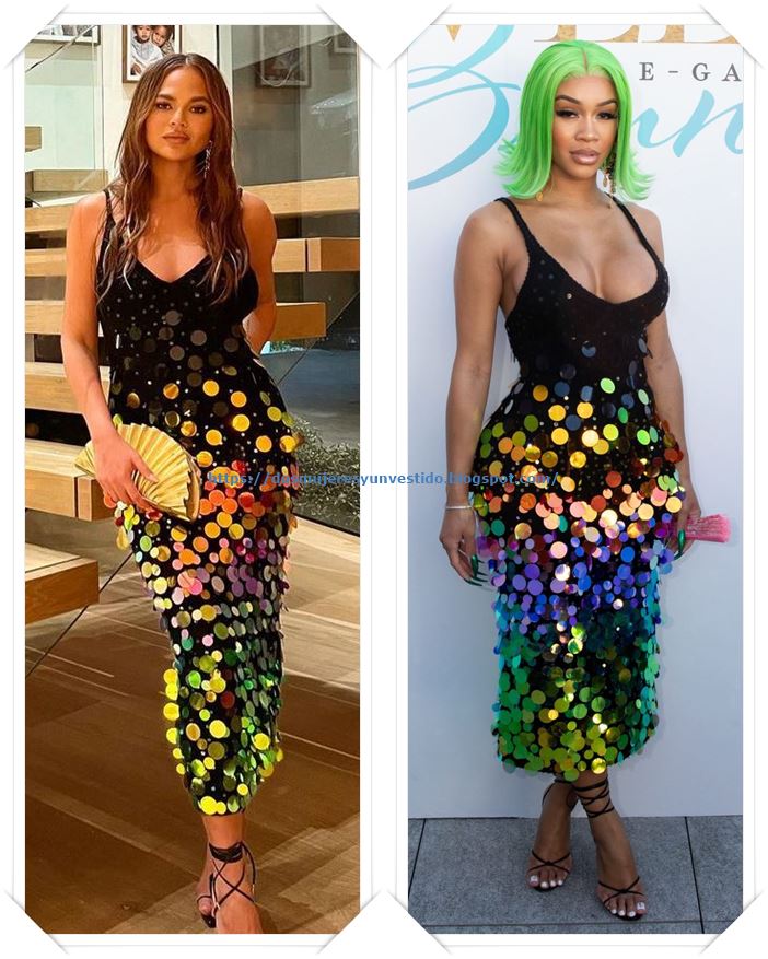 .- Un vestido de lentejuelas de Christopher John Rogers lo llevó Chrissy Teigen; y después se lo vimos a Saweetie en el Pre-Game Brunch.